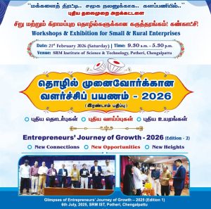 We are going to conduct a One-Day Seminar – Entrepreneurs’ Journey of Growth on February 21st, 2026 (on Sunday) at SRM Institute of Science & Technology – SRM Faculty of Management Block, Potheri, Chengalpattu.